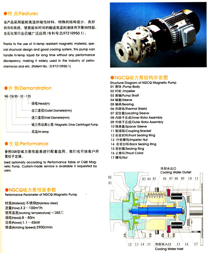 NGCQ型(耐高溫)≤450℃(水冷卻)磁力泵是采用內外磁鋼推拉傳遞,磁路中間采用隔離套將液體封閉在隔離套內,以靜密封取代動密封,使泵的過流部件處于密封狀態,解決了其它泵的機械密封無法避免的跑、冒、滴之弊病。磁力泵選用耐腐蝕、高強度的工程塑料、鋼玉陶瓷、不銹鋼作為制造材料,因此具有良好的抗腐蝕性能,并可使被輸送介質免受染。